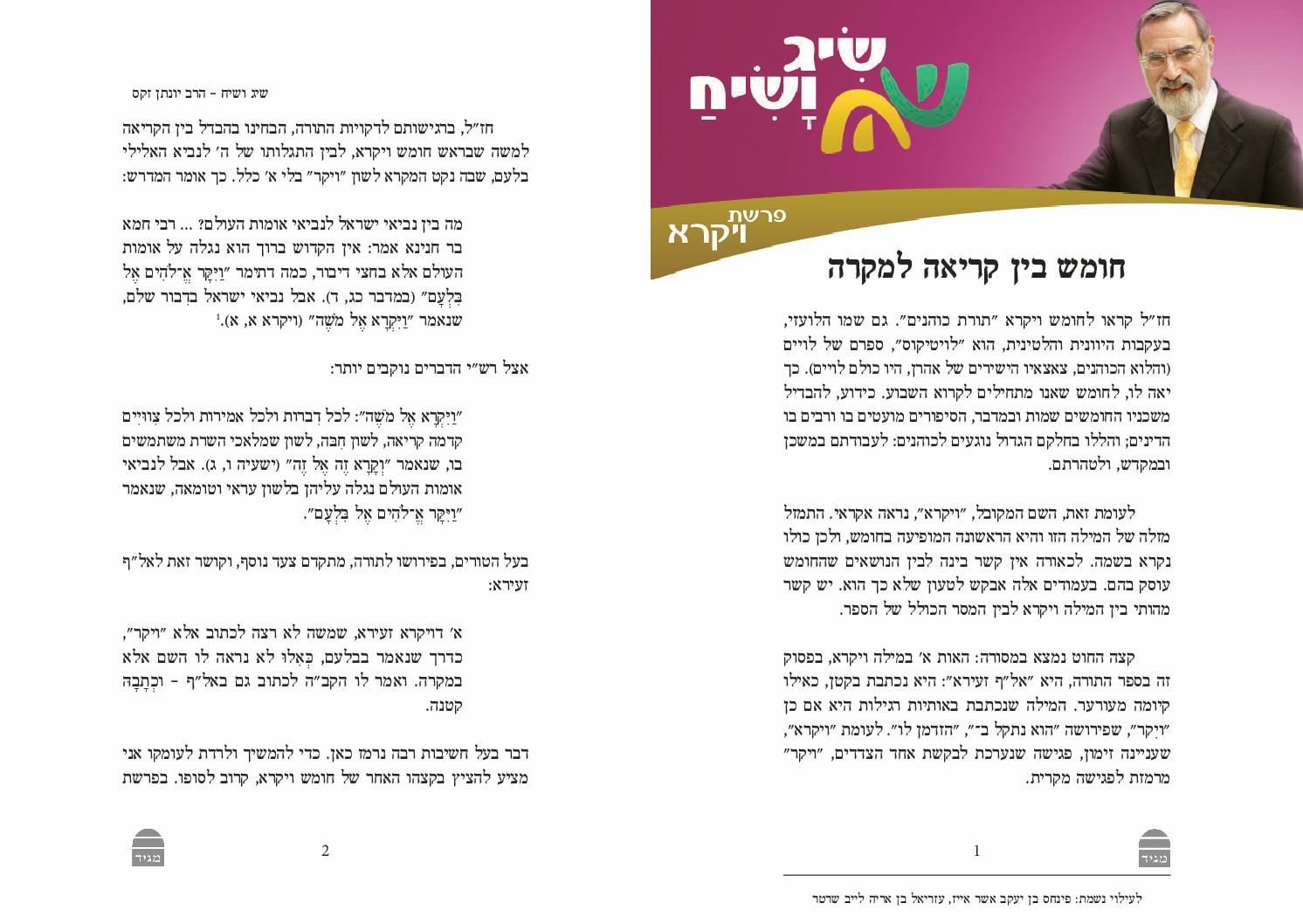 האות א' שבסוף המילה "ויקרא" היא א' נחה. היא כמעט שאינה נשמעת. היא נכתבת כאל"ף זעירא: כמעט שאינה נראית. אל תצפו – רומזת לנו התורה – שנוכחותו של אלוהים בהיסטוריה תהיה תמיד ברורה ובלתי משתמעת לשתי פנים כפי שהיה ביציאת מצרים ובקריעת ים סוף. בדרך כלל היא סמויה, והאבחנה בה תלויה ברגישותנו. מי שמתבונן יראה אותה. מי שמקשיב ישמע אותה. אבל קודם כול יש להתבונן ולהקשיב. אם תבחרו לא לראות ולא לשמוע, ה"ויקרא" יהפוך ל"ויקר". הקריאה תהיה בלתי נשמעת. ההיסטוריה תהיה מקרית.