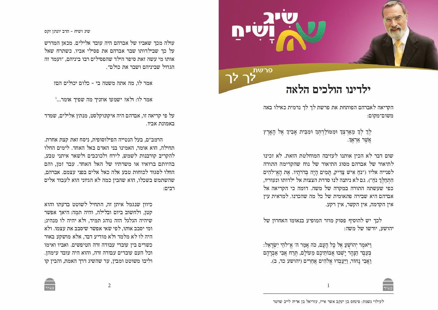 סיפור אברהם יכול להיקרא בשתי דרכים, בהתאם לדרך שבה אנו מיישבים בין סוף פרק יא ופרשת נוח לתחילת פרק יב ופרשת לך לך. קריאה אחת מדגישה את שבירת הכלים. אברהם עזב הכול ופרץ דרך חדשה. הקריאה האחרת מדגישה את ההמשכיות. תרח אבי אברהם התחיל במאבק נגד האלילוּת. הוא יצא לדרך הארוכה אל ארץ כנען, אשר תהיה לארץ הקודש, אך עצר באמצע הדרך. אברהם השלים את המסע שאביו התחיל.