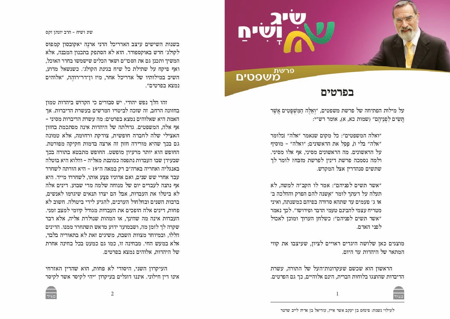 זהו הלך נפש יהודי. יש סבורים כי הקדוש ביהדות טמון בחזונה הרחב, זה שזכה לביטויו המרשים בעשרת הדיברות. אך האמת היא שאלוהים נמצא בפרטים: מה עשרת הדיברות מסיני – אף אלה, המשפטים. גדולתה של היהדות אינה מסתכמת בחזון האצילי שלה לחברה חופשית, צודקת ורחומה, אלא טמונה גם בכך שהיא מורידה חזון זה ארצה בדמות חקיקה מפורטת. החופש הוא יותר מרעיון מופשט. החופש מתבטא בתורה בכך שבעידן שבו העבדות נתפסה כמובנת מאליה – והלוא היא בוטלה באנגליה ואחריה בארה"ב רק במאה ה-19 – היא הורתה לשחרר עבד אחרי שש שנים, ואם אדוניו פצַע אותו, לשחררו מייד. היא אף נתנה לעבדים יום של מנוחה שלמה מדי שבוע. דינים אלה לא ביטלו את העבדות, אבל הם יצרו תנאים שיגרמו לאנשים, ברבות השנים ובחלחול הערכים, להגיע לידי ביטולה. חשוב לא פחות, דינים אלה הופכים את העבדות מגורל קיומי למצב זמני. העבדות אינה מה שהינך, או המהות שנולדת אליה, אלא דבר שקרה לך לזמן מה, ושבמועד ידוע מראש תשתחרר ממנו. הדינים הללו, ובמיוחד מצוות השבת, משיגים זאת לא בתאוריה בלבד, אלא במעש החי. מבחינה זו, כמו גם כמעט בכל בחינה אחרת של היהדות, אלוהים נמצא בפרטים.