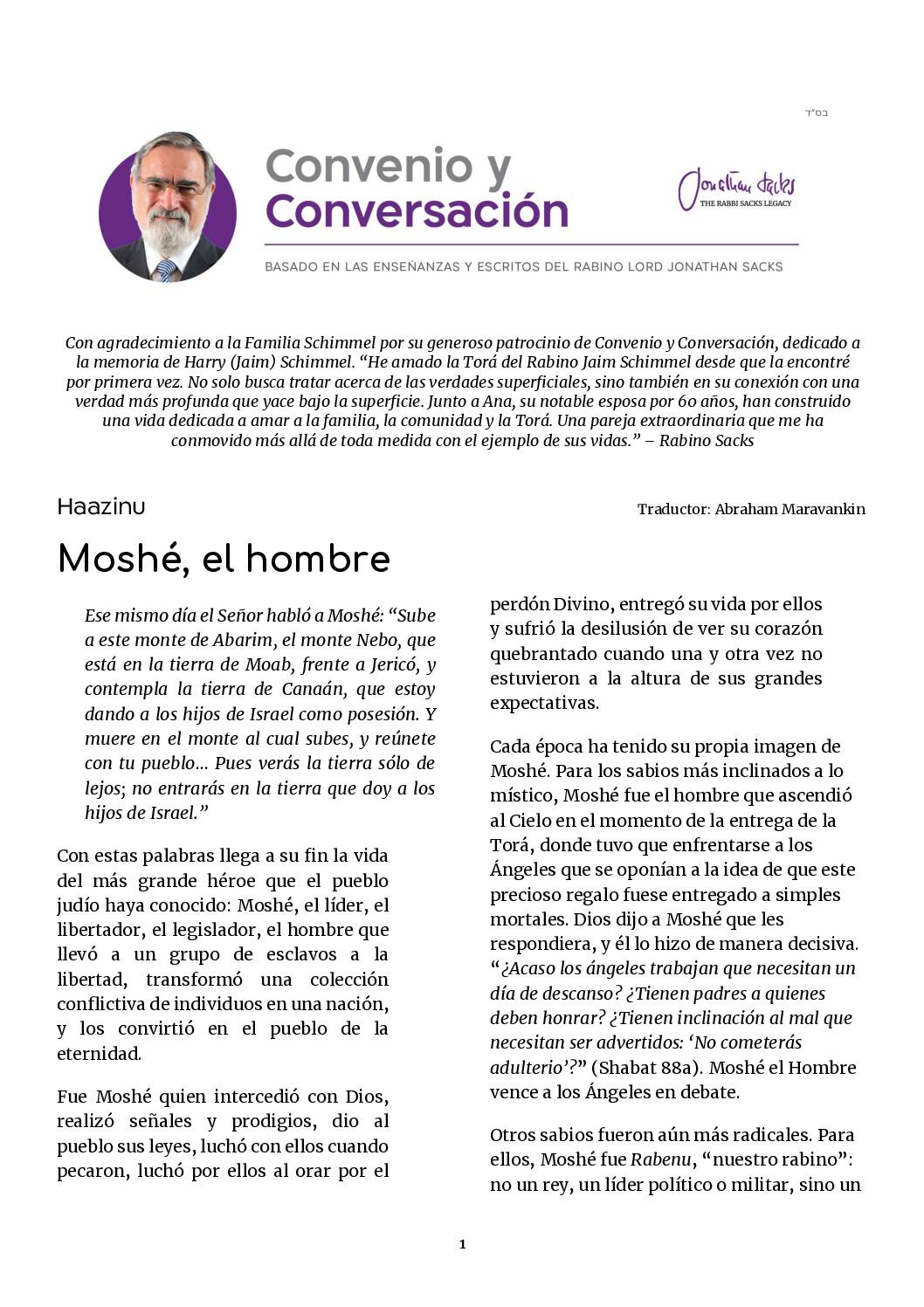 Moshé no existe en el judaísmo como objeto de culto, sino como modelo al cual cada uno de nosotros puede aspirar. Es el símbolo eterno de un ser humano engrandecido por lo que luchó por alcanzar, no por lo que efectivamente logró. Los títulos que le confiere la Torá – “el hombre Moshé”, “siervo de Dios”, “un hombre de Dios” – son tanto más impresionantes por su modestia. Moshé continúa inspirando.