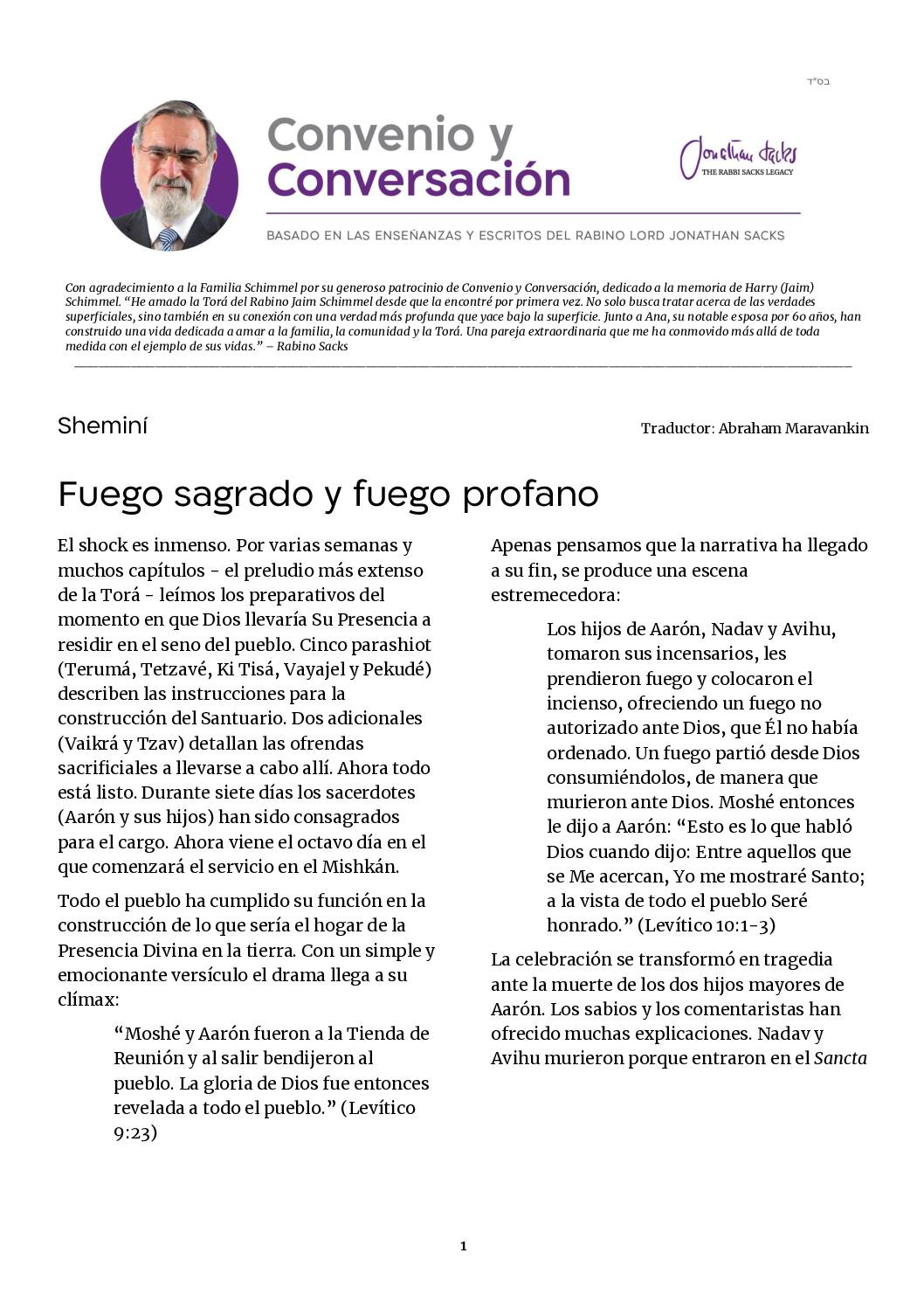Los hijos de Aarón, Nadav y Avihu, tomaron sus incensarios, les prendieron fuego y colocaron el incienso, ofreciendo un fuego no autorizado ante Dios, que Él no había ordenado. Un fuego partió desde Dios consumiéndolos, de manera que murieron ante Dios. Moshé entonces le dijo a Aarón: “Esto es lo que habló Dios cuando dijo: Entre aquellos que se Me acercan, Yo me mostraré Santo; a la vista de todo el pueblo Seré honrado.”