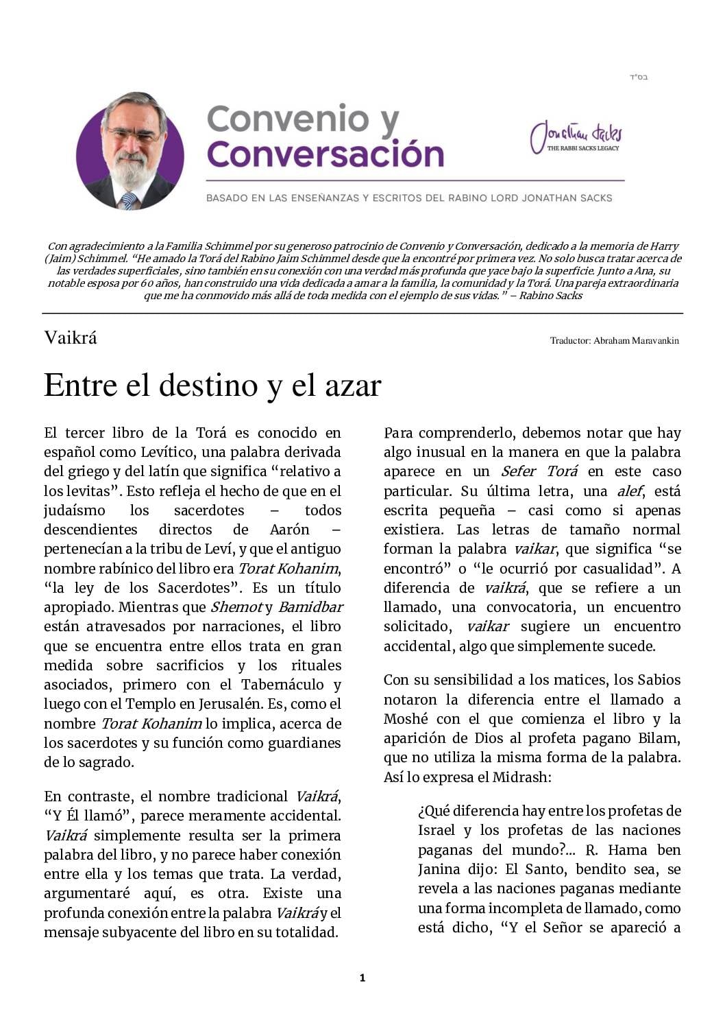 No hay nada incoherente en una idea así. Quienes creen en ella tendrán mucho con qué justificarla. De hecho, dice Dios en la tojajá: si crees que la historia es casualidad, entonces se volverá así. Pero en verdad no es así. La historia del pueblo judío – como incluso no judíos como Pascal, Rousseau y Tolstoy declararon elocuentemente – da testimonio de la presencia de Dios en su seno. Solo así pudo sobrevivir un pueblo tan pequeño, vulnerable y relativamente impotente, y aún hoy decir – después del Holocausto – Am Israel Jai, el pueblo judío vive. Y así como la historia judía no es mera casualidad, tampoco es mera coincidencia que la primera palabra del libro central de la Torá sea Vaikrá, “Y Él llamó”.
