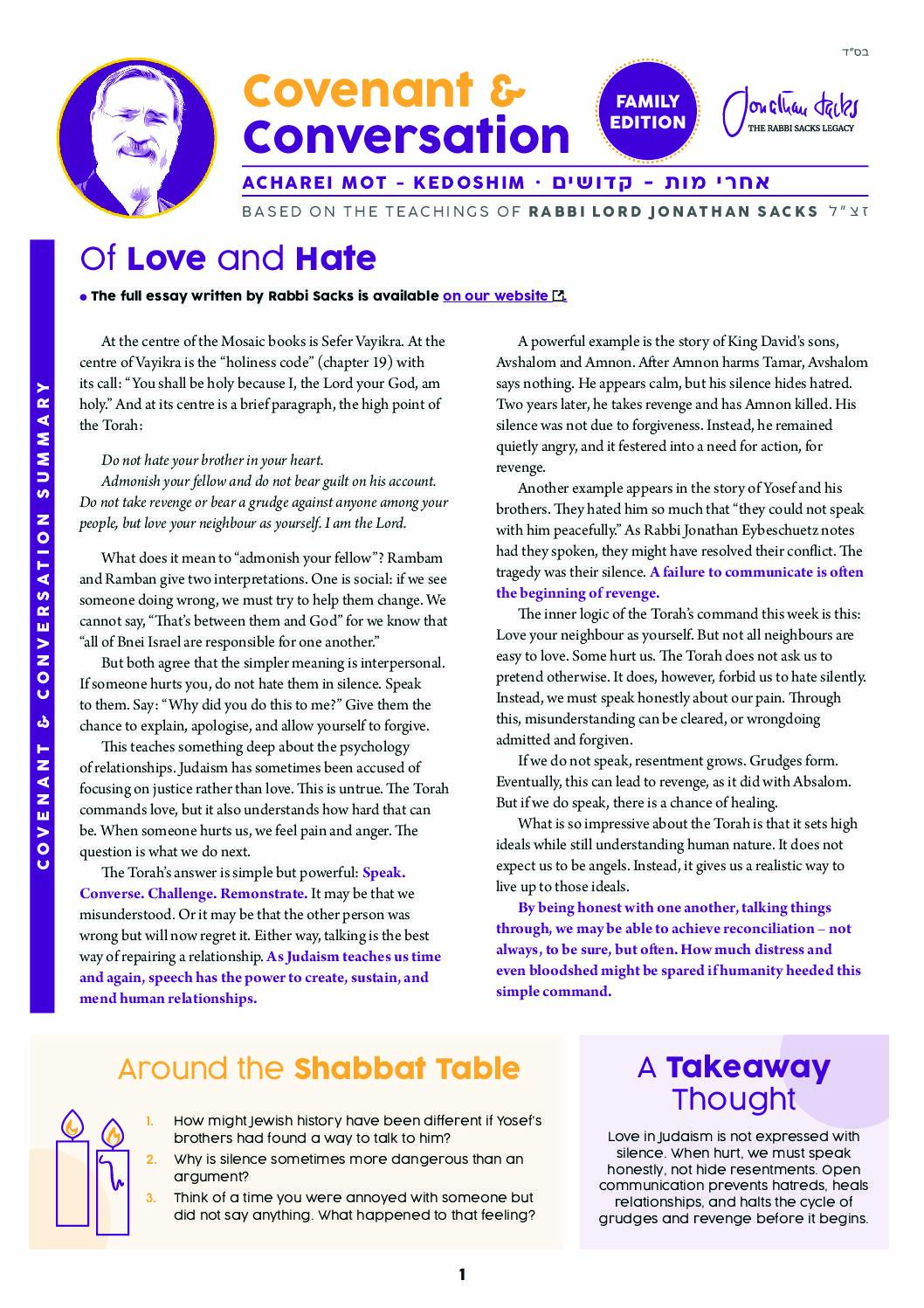 Love in Judaism is not expressed with silence. When hurt, we must speak honestly, not hide resentments. Open communication prevents hatreds, heals relationships, and halts the cycle of grudges and revenge before it begins.