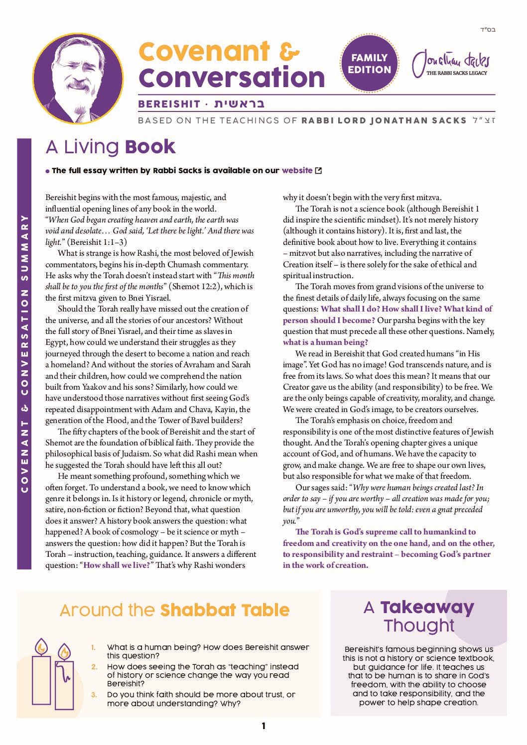 Bereishit’s famous beginning shows us this is not a history or science textbook, but guidance for life. It teaches us that to be human is to share in God’s freedom, with the ability to choose and to take responsibility, and the power to help shape creation.