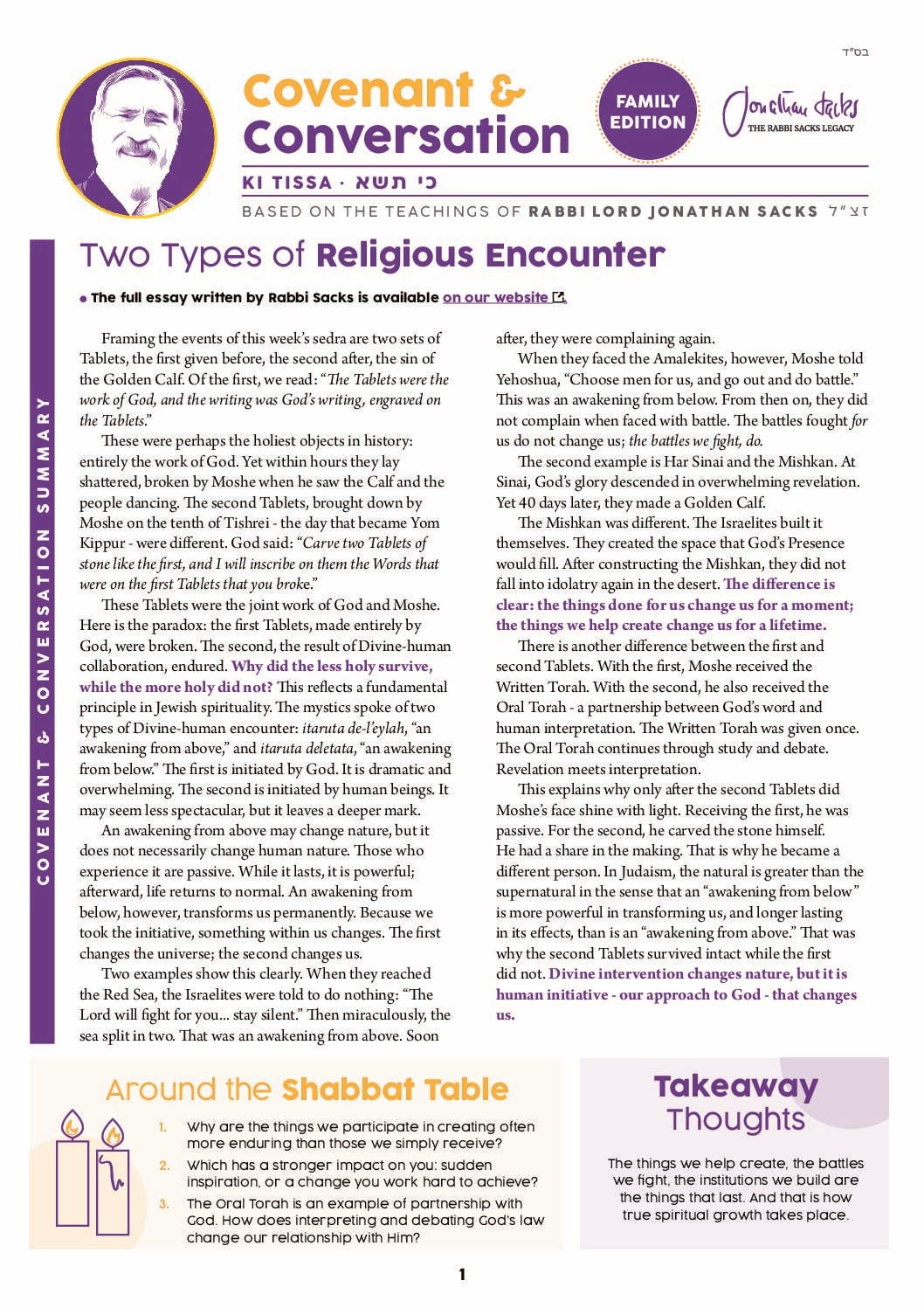 These Tablets were the joint work of God and Moshe. Here is the paradox: the first Tablets, made entirely by God, were broken. The second, the result of Divine-human collaboration, endured. Why did the less holy survive, while the more holy did not? This reflects a fundamental principle in Jewish spirituality. The mystics spoke of two types of Divine-human encounter: itaruta de-l’eylah, “an awakening from above,” and itaruta deletata, “an awakening from below.” The first is initiated by God. It is dramatic and overwhelming. The second is initiated by human beings. It may seem less spectacular, but it leaves a deeper mark.