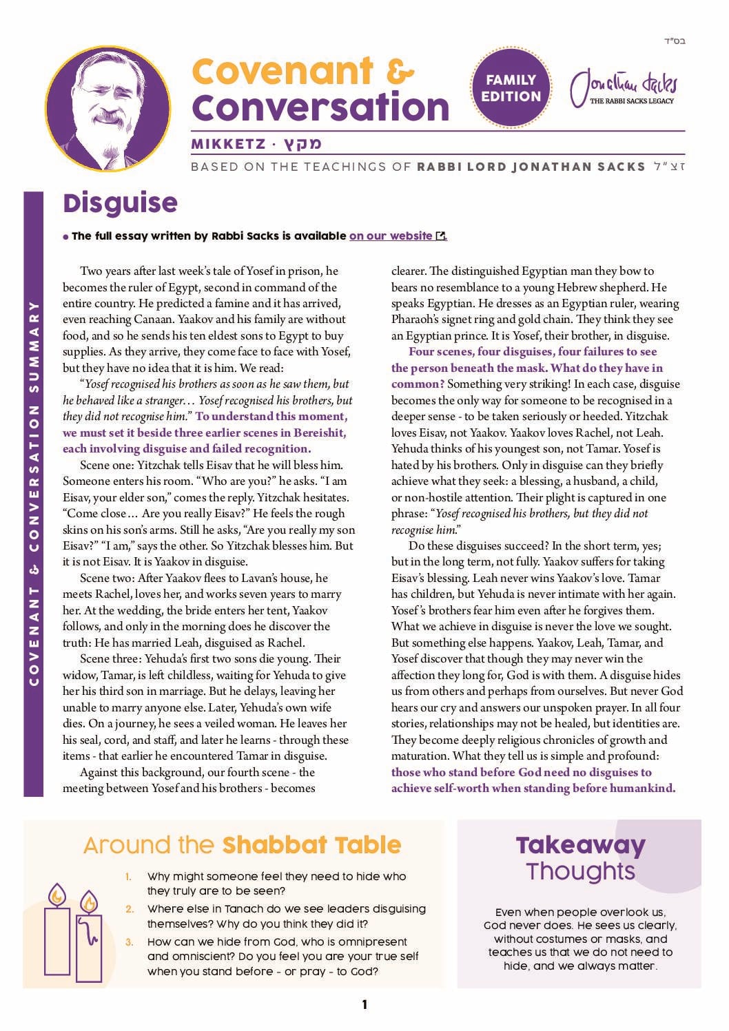 But something else happens. Yaakov, Leah, Tamar, and Yosef discover that though they may never win the affection they long for, God is with them. A disguise hides us from others and perhaps from ourselves. But never God hears our cry and answers our unspoken prayer. In the aftermath of all four stories, relationships may not be healed, but identities are. They become deeply religious chronicles of growth and maturation. What they tell us is simple and profound: those who stand before God need no disguises to achieve self-worth when standing before humankind.