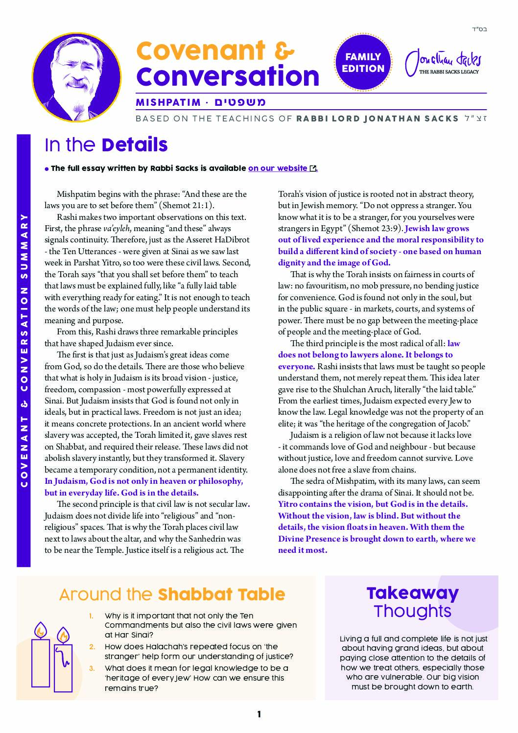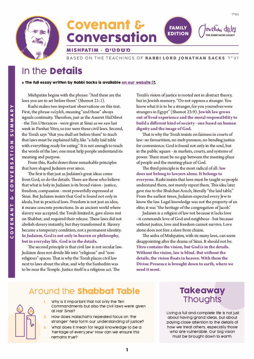 The sedra of Mishpatim, with its many laws, can seem disappointing after the drama of Sinai. It should not be. Yitro contains the vision, but God is in the details. Without the vision, law is blind. But without the details, the vision floats in heaven. With them the Divine Presence is brought down to earth, where we need it most.