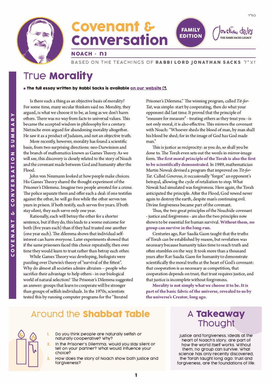 More recently, however, morality has found a scientific basis, from two surprising directions: neo-Darwinism and the branch of mathematics known as Games Theory. As we will see, this discovery is closely related to the story of Noach and the covenant made between God and humanity after the Flood.