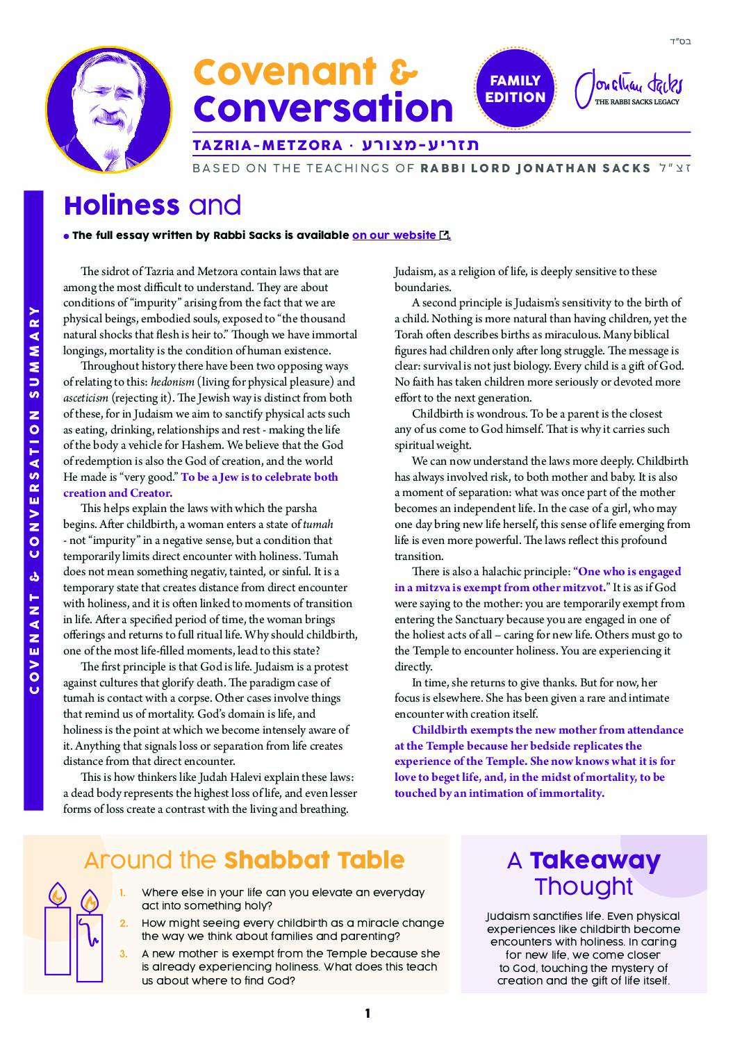 The Summary This is an abridged version of the essay Holiness and Childbirth, written by Rabbi Sacks in 2009. In Judaism we sanctify the physical.…