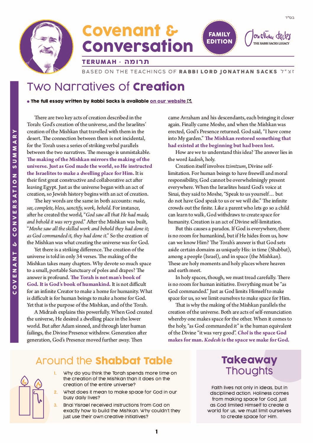 There are two key acts of creation described in the Torah: God’s creation of the universe, and the Israelites’ creation of the Mishkan that travelled with them in the desert. The connection between them is not incidental, for the Torah uses a series of striking verbal parallels between the two narratives. The message is unmistakable. The making of the Mishkan mirrors the making of the universe. Just as God made the world, so He instructed the Israelites to make a dwelling place for Him. It is their first great constructive and collaborative act after leaving Egypt. Just as the universe began with an act of creation, so Jewish history begins with an act of creation.