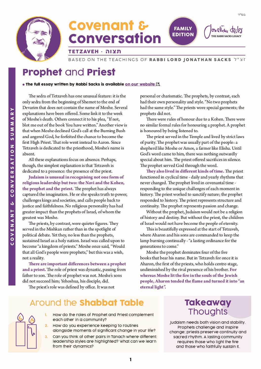 Judaism needs both vision and stability. Prophets challenge and inspire change; priests preserve continuity and sacred rhythm. A lasting community requires those who light the fire and those who faithfully sustain it.