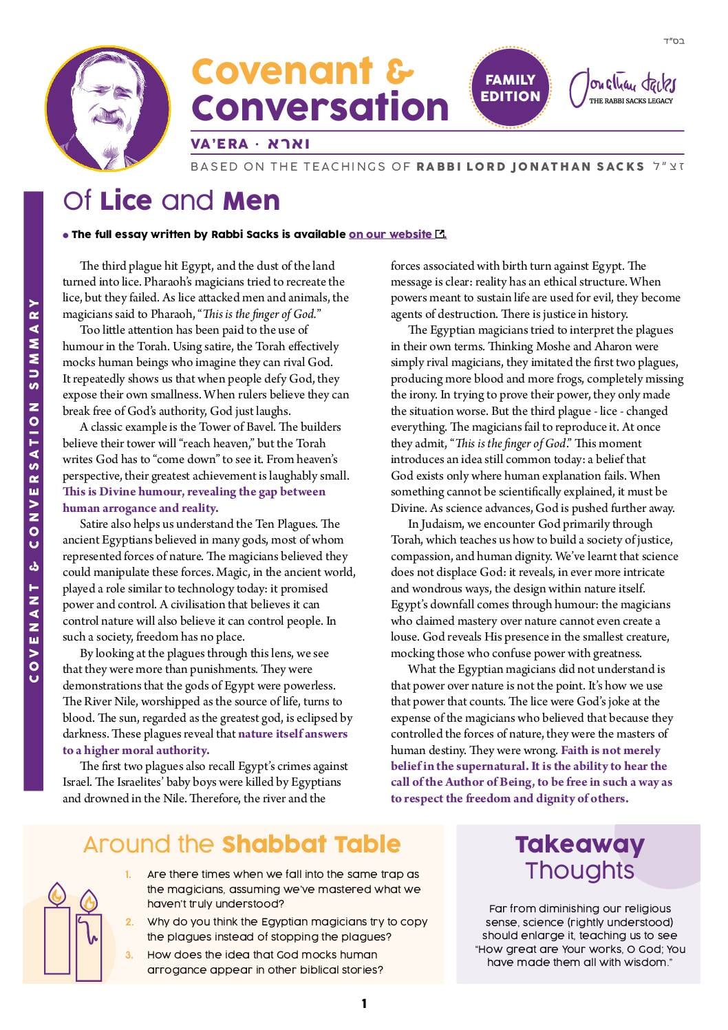 The humour Rabbi Sacks discusses in the main essay of the week teaches us something profound: true wisdom means recognising our limits before we’re forced to. The magicians who could manipulate rivers couldn’t handle a louse. Sometimes the most significant strength is admitting what we don’t know.