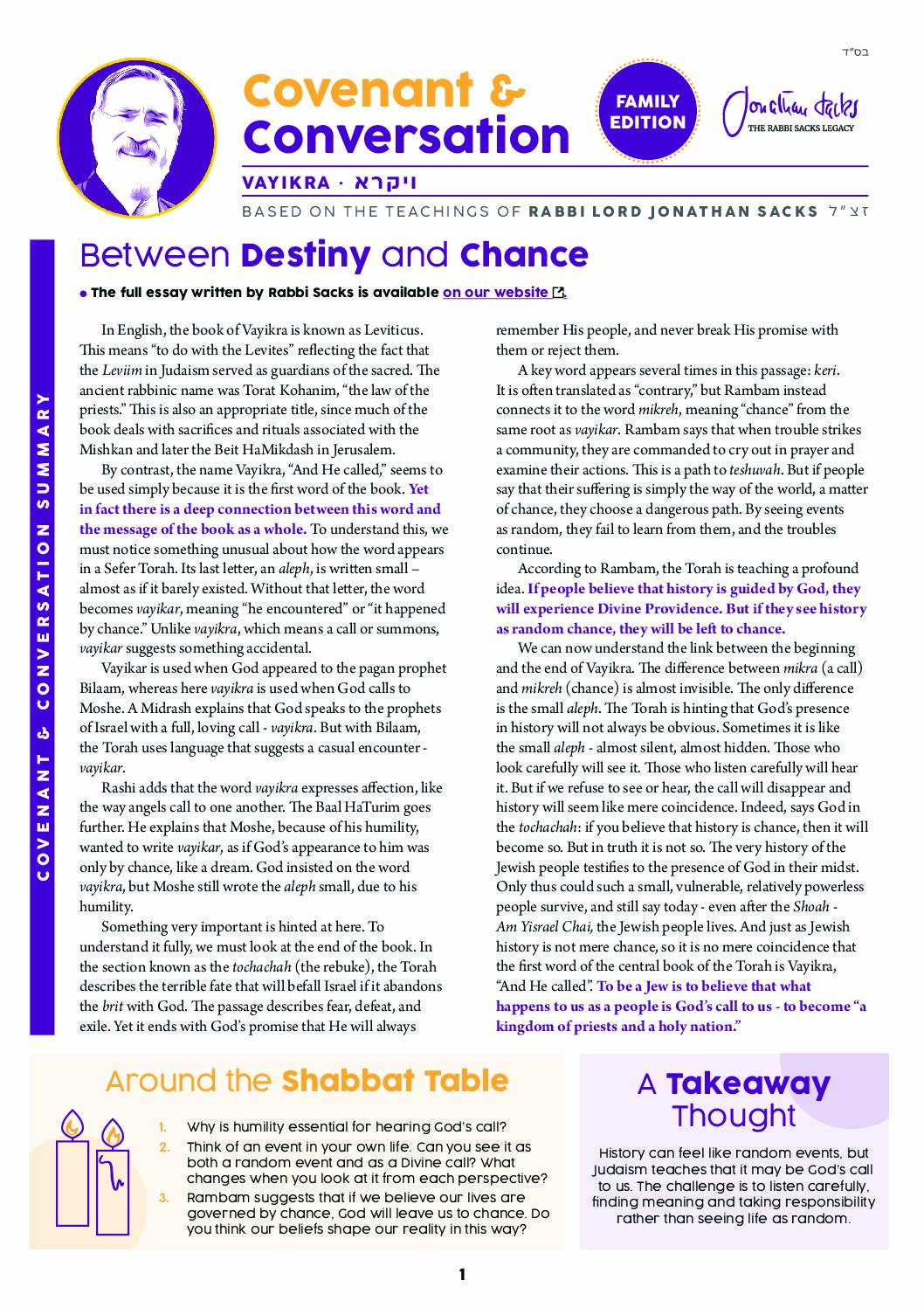 By contrast, the name Vayikra, “And He called,” seems to be used simply because it is the first word of the book. Yet in fact there is a deep connection between this word and the message of the book as a whole. To understand this, we must notice something unusual about how the word appears in a Sefer Torah. Its last letter, an aleph, is written small – almost as if it barely existed. Without that letter, the word becomes vayikar, meaning “he encountered” or “it happened by chance.” Unlike vayikra, which means a call or summons, vayikar suggests something accidental.