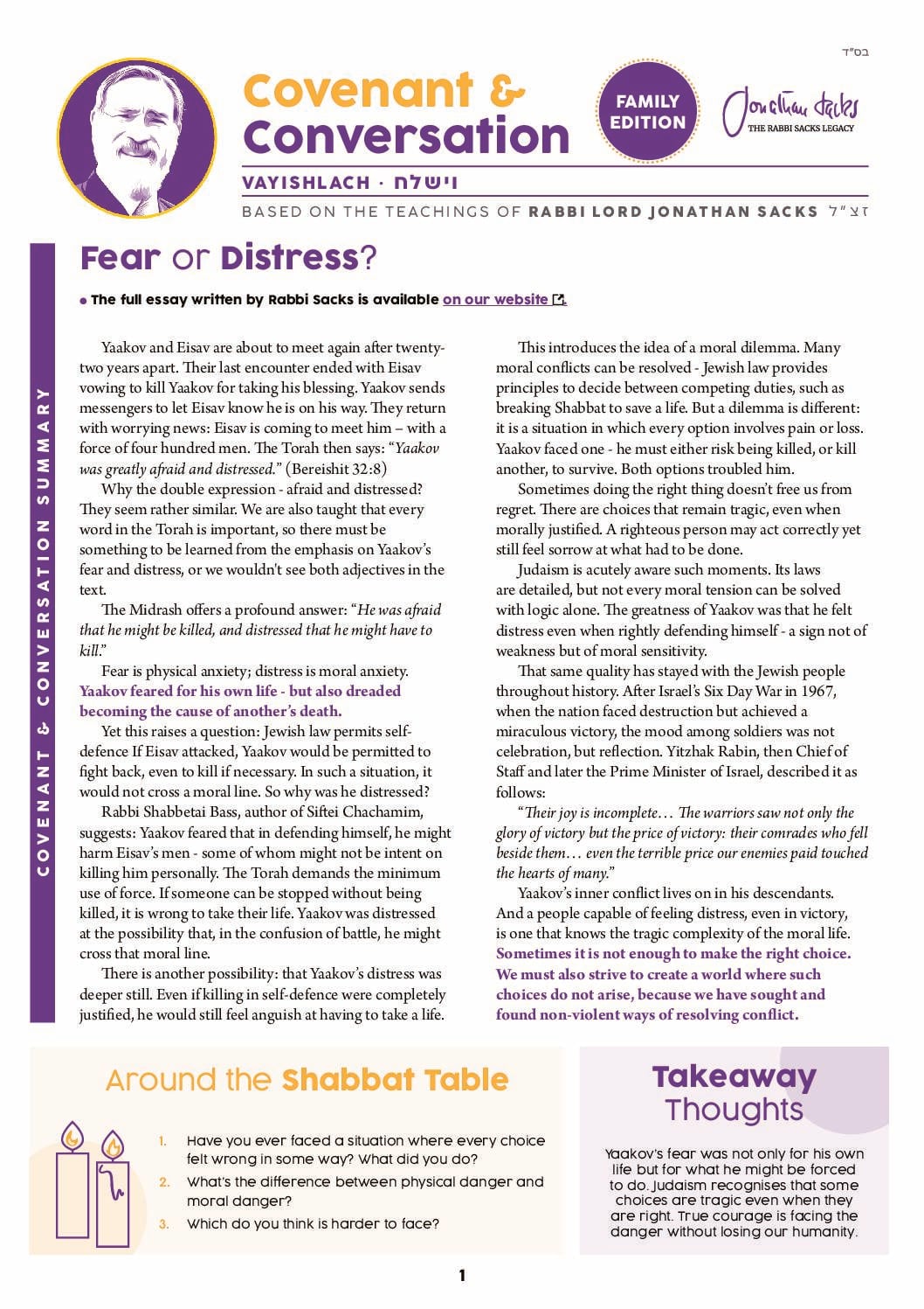 “The heroes of our faith do not live charmed lives. They suffer exiles, know danger, have their hopes disappointed and their expectations delayed. They fight, they struggle, but they neither give in nor give up. They are not serene. Sometimes they laugh in disbelief; there are times when they fear, tremble, weep, and even give way to anger. For they are human beings, not angels; they are people with whom we can identify, not saints to be worshipped. Yaakov teaches us that we cannot pre-empt crisis, nor should we minimise it, but we can survive it, thus becoming worthy of bearing the name of one who has struggled with God and with man and prevailed.”