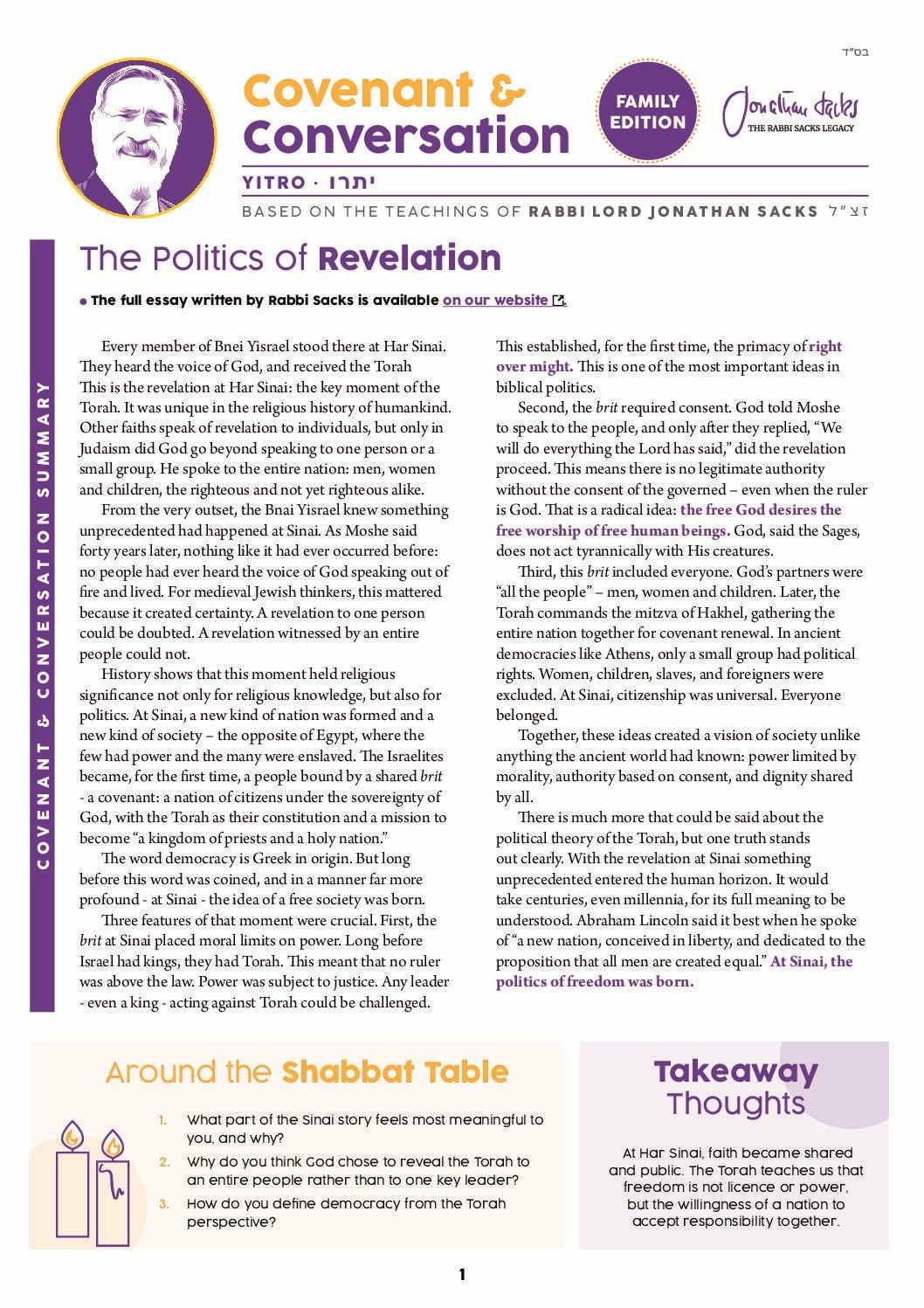 Before the Torah is given, God asks the people if they are willing to enter the covenant. Only after they answer together, “All that God has spoken, we shall do,” does the revelation continue. Sinai teaches that faith is not imposed from above but accepted from within. Responsibility is something we carry together, not something handed to us by force. Rabbi Sacks highlights how radical this moment is.