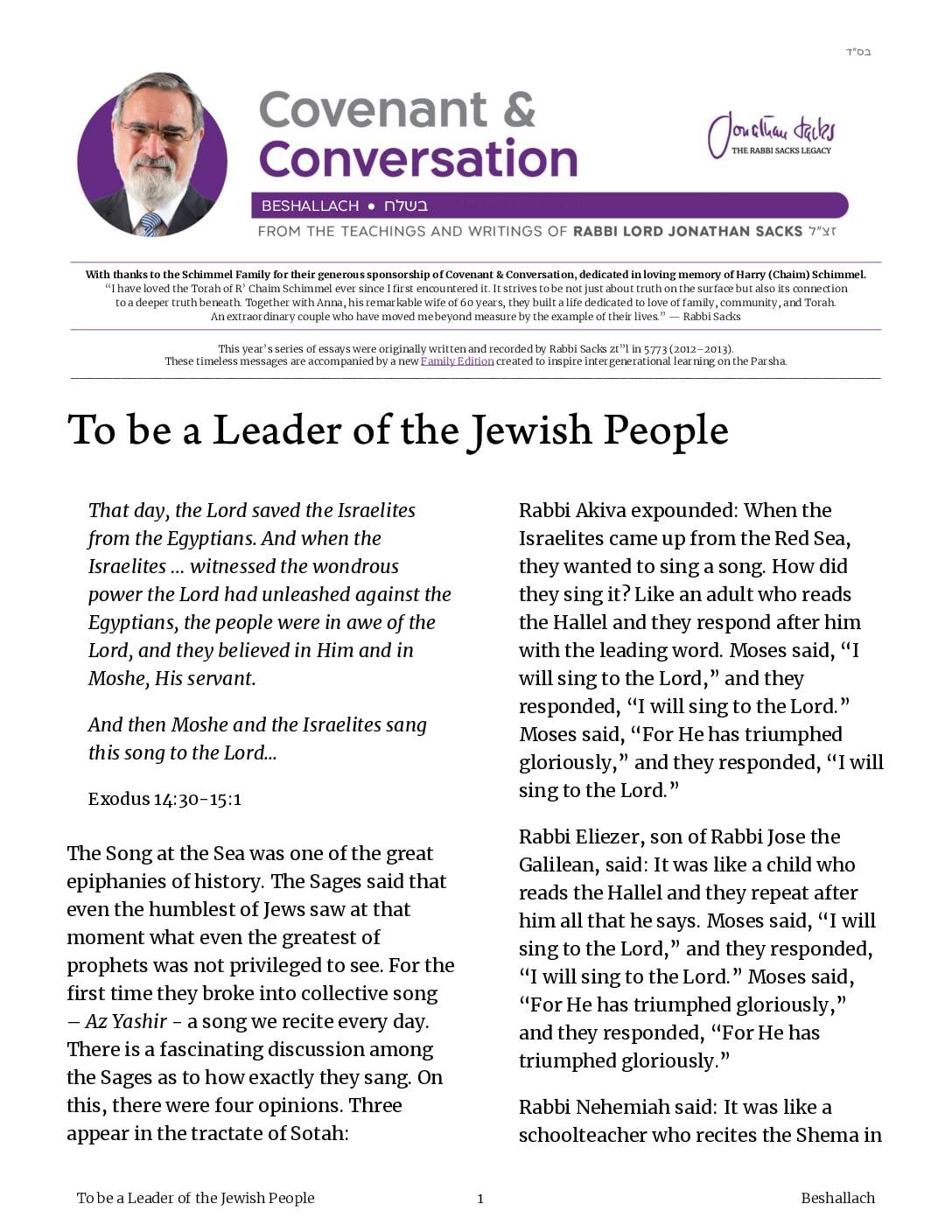 The prelude to the Song at the Sea states that the people “believed in God, and in His servant Moses” – the first time they are described as believing in Moses’ leadership. On this, the Sages asked: What is it to be a leader of the Jewish people? Is it to hold official authority, of which the supreme example is a king (“The rabbis are called kings”)? Is it to have the kind of personal relationship with one’s followers that rests not on honour and deference but on encouraging people to grow, accept responsibility and continue the journey you have begun? Or is it something in between? There is no single answer.