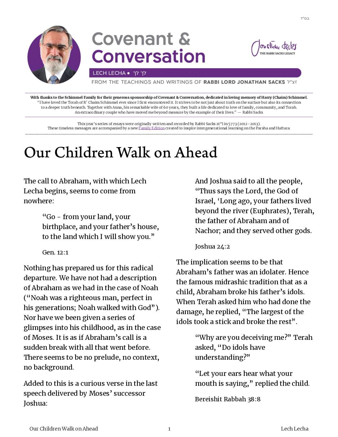 The story of Abraham can be read in two ways, depending on how we reconcile the end of chapter 11 with the beginning of chapter 12. One reading emphasises discontinuity: Abraham broke with all that went before. The other, continuity: Terah, his father, had already begun to wrestle with idolatry. He had set out on the long walk to the land which would eventually become holy, but stopped halfway. Abraham completed the journey his father began.
