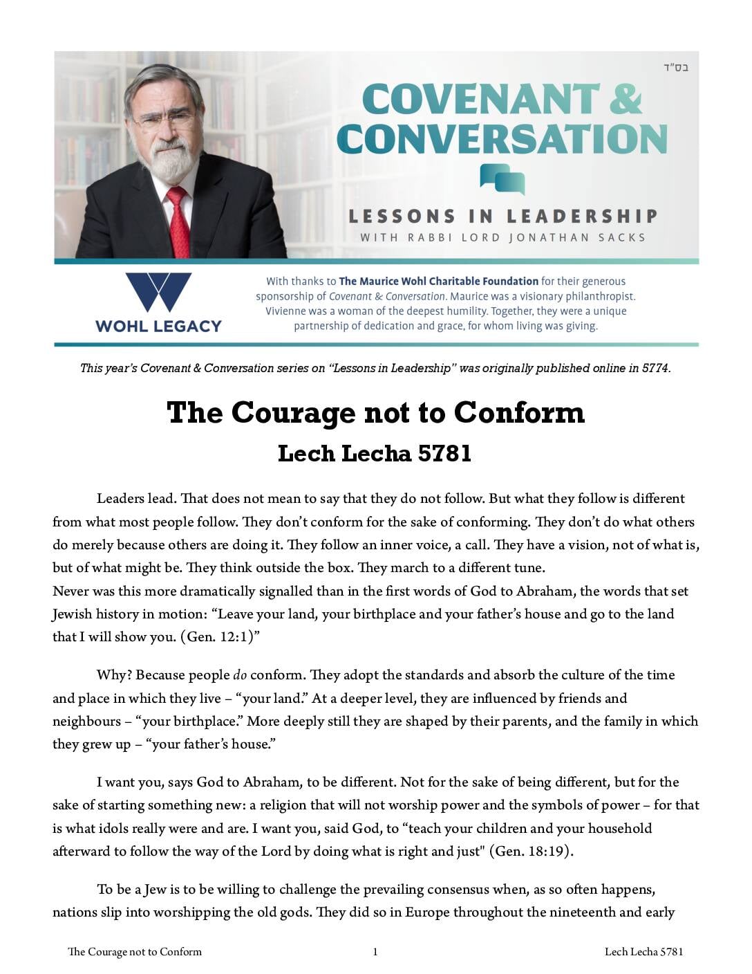 That is why Abraham, at the start of his mission, was told to leave “his land, his birthplace and his father’s house,” to free himself from the pressure to conform. Leaders must be prepared not to follow the consensus. One of the great writers on leadership, Warren Bennis, writes: “By the time we reach puberty, the world has shaped us to a greater extent than we realise. Our family, friends, and society in general have told us – by word and example – how to be. But people begin to become leaders at that moment when they decide for themselves how to be.”[4]