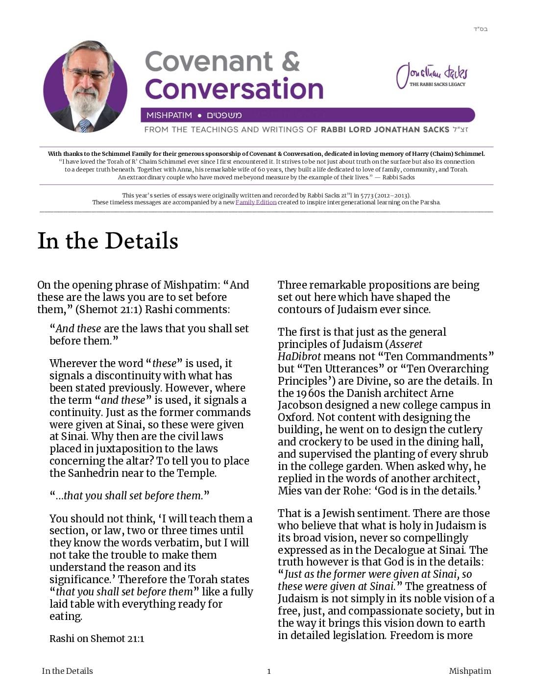 The sedra of Mishpatim, with its detailed rules and regulations, can sometimes seem a let-down after the breathtaking grandeur of the revelation at Sinai. It should not be. Yitro contains the vision, but God is in the details. Without the vision, law is blind. But without the details, the vision floats in heaven. With them the Divine Presence is brought down to earth, where we need it most.