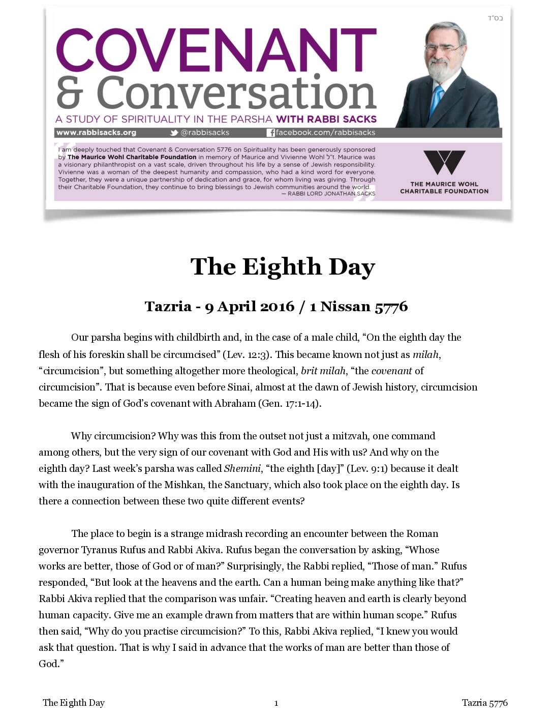 Why circumcision? Why was this from the outset not just a mitzvah, one command among others, but the very sign of our covenant with God and His with us? And why on the eighth day? Last week’s parsha was called Shemini, “the eighth [day]” (Lev. 9:1) because it dealt with the inauguration of the Mishkan, the Sanctuary, which also took place on the eighth day. Is there a connection between these two quite different events?