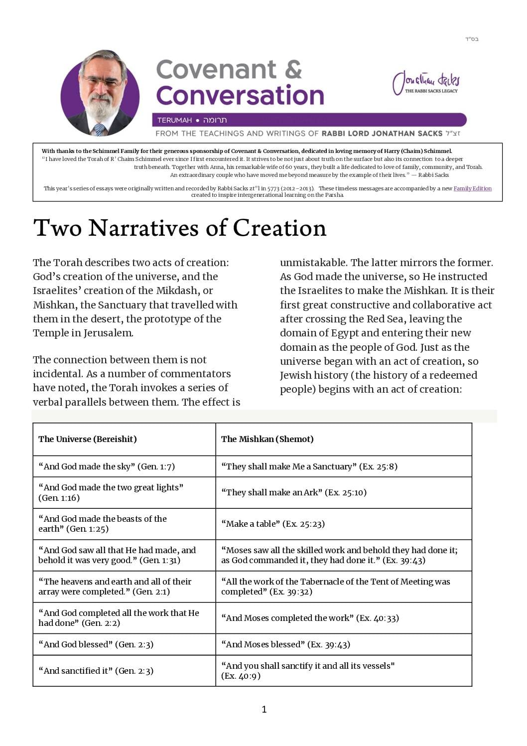 The Torah describes two acts of creation: God’s creation of the universe, and the Israelites’ creation of the Mikdash, or Mishkan, the Sanctuary that travelled with them in the desert, the prototype of the Temple in Jerusalem.