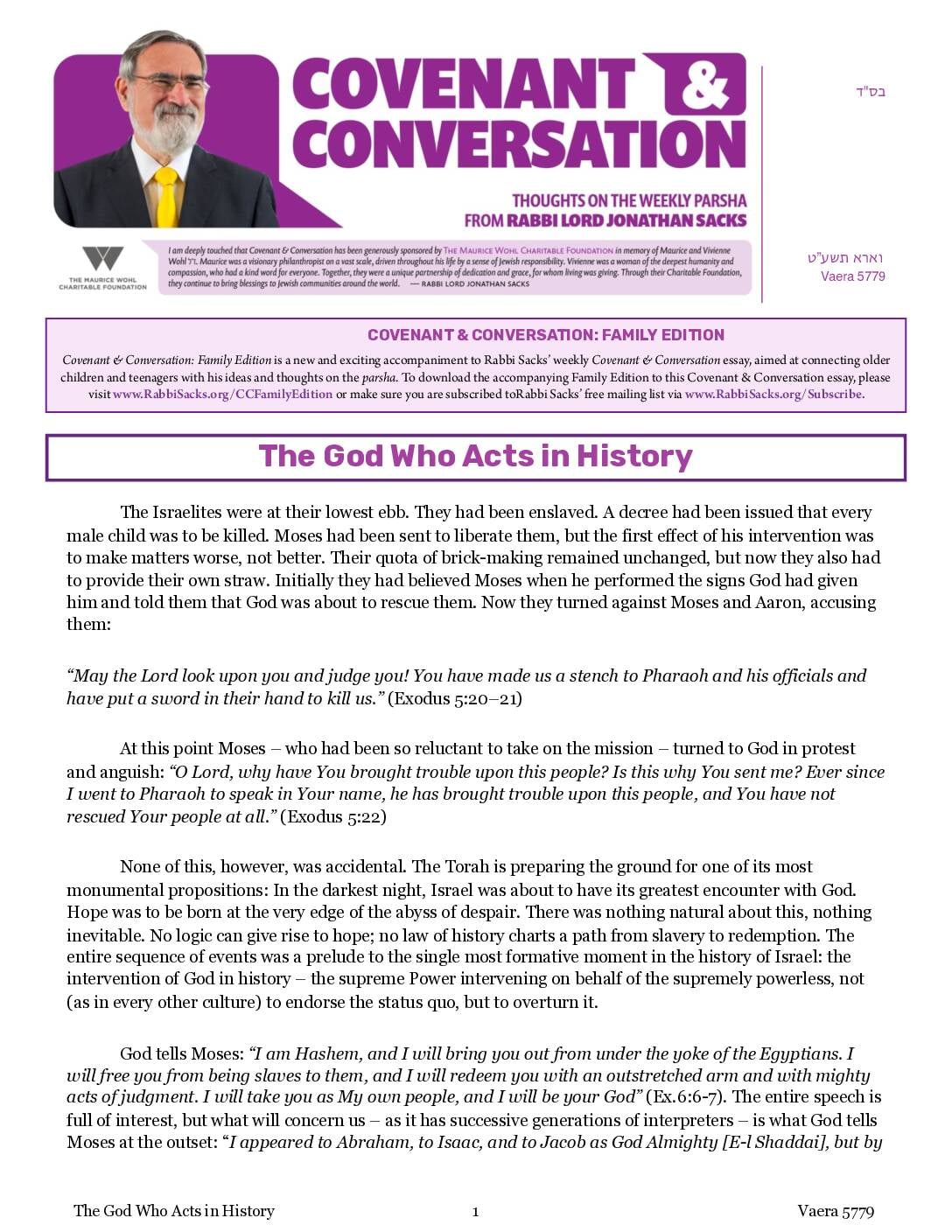 This was something radically new – not just to Israel but to humanity as a whole. Until then, God (or the gods) was known through nature. God was in the sun, the stars, the rain, the storm, the fertility of the fields and the sequence of the seasons. When there was drought and famine, the gods were being angry. When there was produce in plenty, the gods were showing favour. The gods were nature personified. Never before had God intervened in history, to rescue a people from slavery and set them on the path to freedom. This was a revolution, at once political and intellectual.