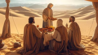 It is one of the most famous scenes in the Bible. Abraham is sitting at the entrance to his tent in the heat of the day when three strangers pass by. He urges them to rest and take some food. The text calls them ‘anashim’ – ‘men’. They are in fact angels, coming to tell Sarah that she will have a child (Genesis 18).