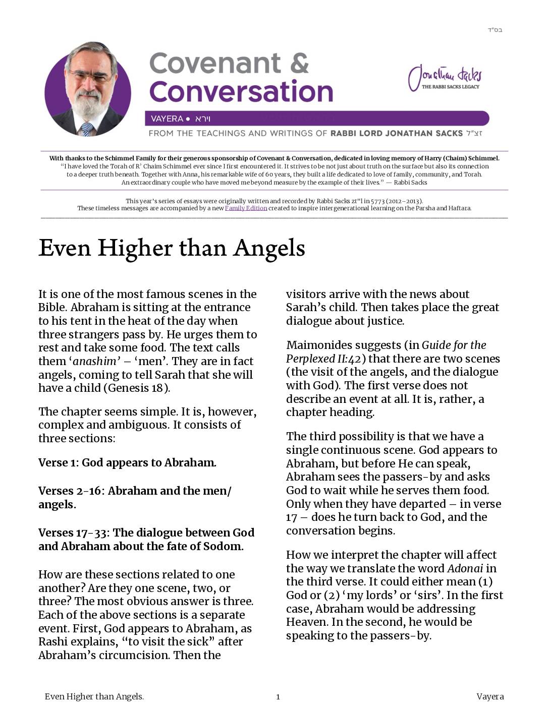 One of the most beautiful comments on this episode was given by Rabbi Shalom of Belz who noted that in verse 2, the visitors are spoken of as standing above Abraham [nitzavim alav]. In verse 8, Abraham is described as standing above them [omed alehem]. He said: at first, the visitors were higher than Abraham because they were angels and he a mere human being. But when he gave them food and drink and shelter, he stood even higher than the angels. We honour God by honouring His image, humankind.