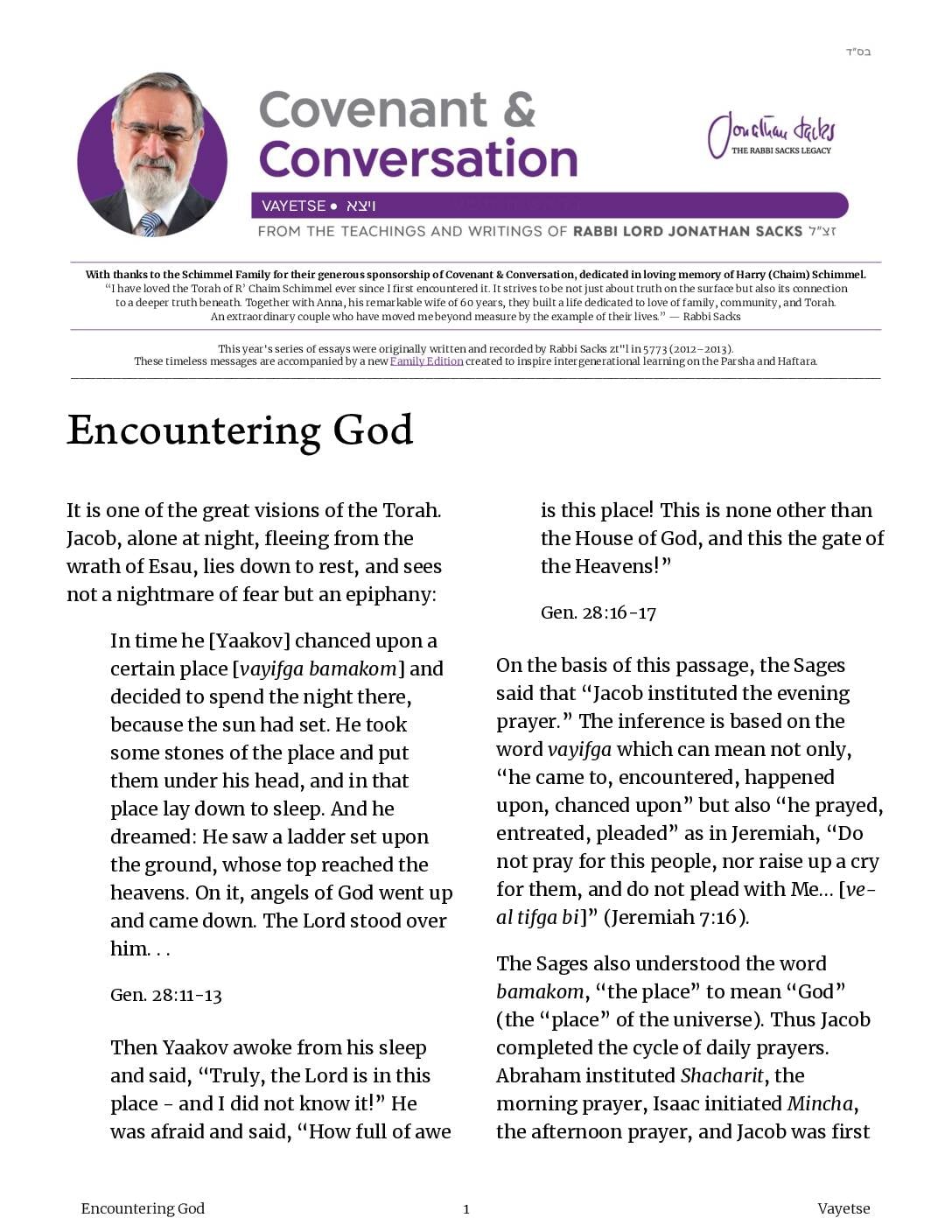 Jacob’s prayer is very different. He does not initiate it. His thoughts are elsewhere – on Esau from whom he is escaping, and on Laban to whom he is travelling. Into this troubled mind comes a vision of God and the angels and a stairway connecting earth and heaven. He has done nothing to prepare for it. It is unexpected. Jacob literally “encounters” God as we can sometimes encounter a familiar face among a crowd of strangers. This is a meeting brought about by God, not man. That is why Jacob’s prayer could not be made the basis of a regular obligation. None of us knows when the presence of God will suddenly intrude into our lives.