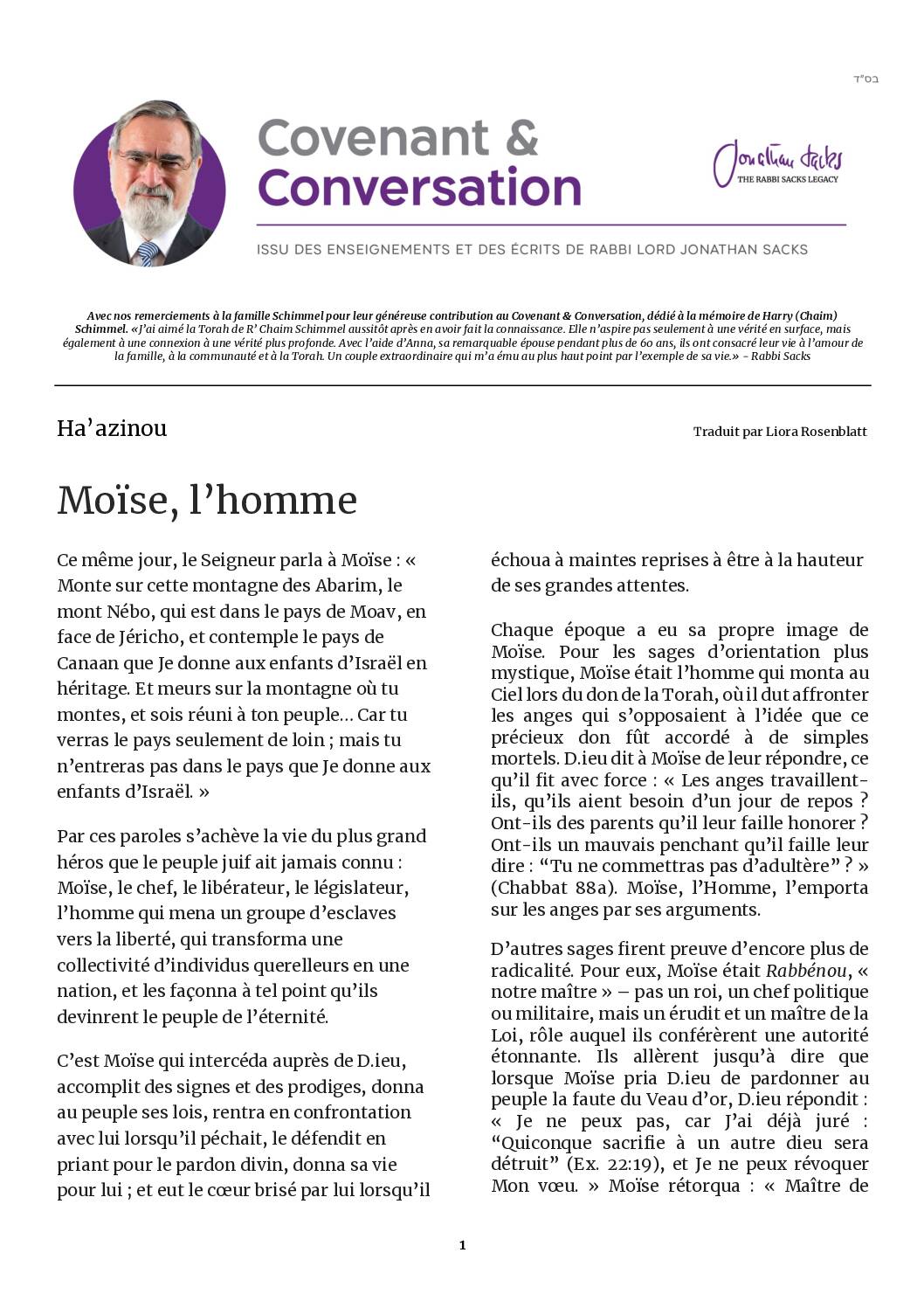 Voilà Moïse, l’homme qui refusa de « s’en aller doucement dans cette nuit obscure », symbole éternel de la façon dont un être humain, sans cesser d’être humain, peut devenir un géant de la vie morale. Voilà la grandeur et l’humilité d’aspirer à être « un serviteur de D.ieu ».