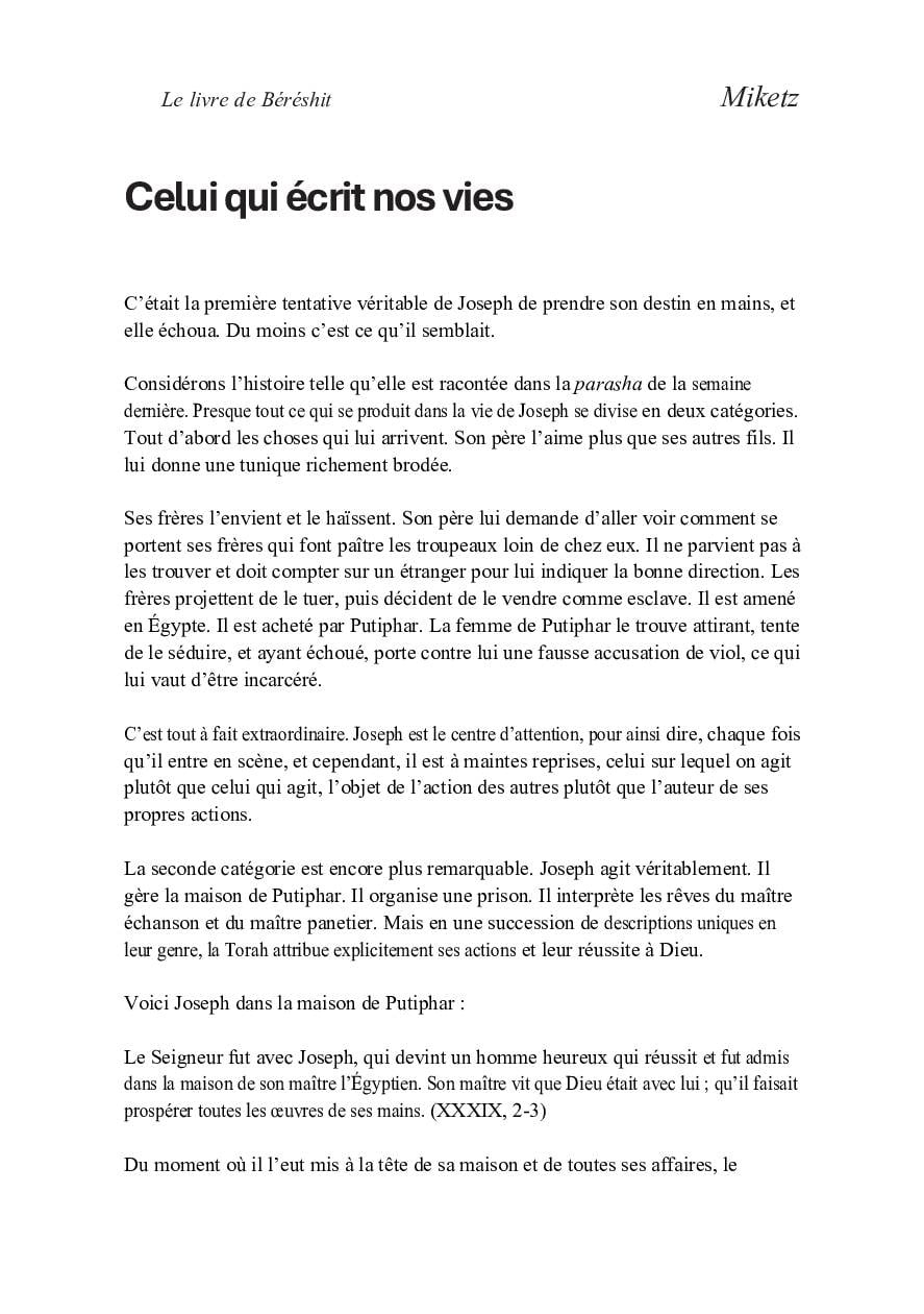 Dieu et nous sommes co-auteurs de l’histoire humaine. Sans nos efforts, nous ne pouvons rien accomplir. Mais sans l’aide de Dieu, nous n’obtiendrions rien non plus. Le judaïsme a trouvé une manière simple de résoudre ce paradoxe. Nous assumons la responsabilité du mal que nous faisons, et nous remercions Dieu pour le bien que nous accomplissons. Joseph est notre mentor. Lorsqu’il est contraint d’agir durement, il pleure. Mais lorsqu’il raconte sa réussite à ses frères, il l’attribue à Dieu. C’est ainsi que nous devrions vivre nous aussi.