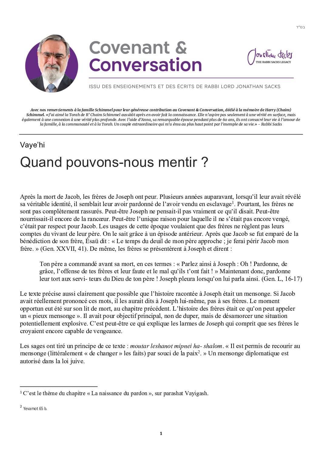 Lorsqu’ils sont confrontés à un choix en matière de relations interper- sonnelles, les sages privilégient la paix par rapport à la vérité, notamment parce que la vérité peut s’épanouir dans la paix alors qu’elle est souvent la première victime de la guerre. Ainsi, les frères n’ont pas commis de faute en choisissant de mentir à Joseph pour préserver la paix au sein de la famille. Cela leur rappe- lait à tous cette profonde vérité : non seulement leur père humain, maintenant décédé, mais également leur Père céleste, éternellement vivant, souhaite que le peuple de l’alliance soit en paix