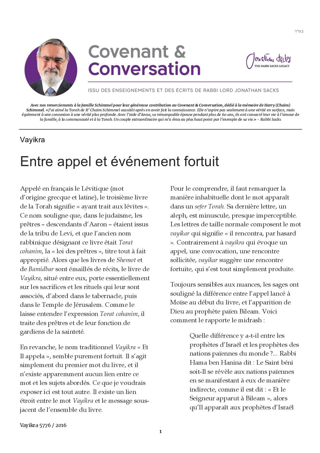 Une telle idée n’a rien d’incohérent. Ceux qui y croient pourront sans difficulté en prouver le bien-fondé. D’ailleurs, dans la tokha’ha, Dieu dit : si vous croyez que l’histoire est hasard, alors, elle le deviendra. Mais en réalité, il n’en est pas ainsi. L’histoire du peuple juif – comme l’ont exprimé avec éloquence des non Juifs comme Pascal, Rousseau et Tolstoï – témoigne de la présence de Dieu en son sein. C’est ainsi qu’un peuple aussi petit, vulnérable et relativement impuissant peut survivre et dire encore aujourd’hui – après la Shoah – am Israël ‘haï, le peuple d’Israël vit. Tout comme l’histoire juive n’est pas le fruit du hasard, ce n’est pas non plus une simple coïncidence si le premier mot du livre central de la Torah est Vayikra, « Et Il appela ».